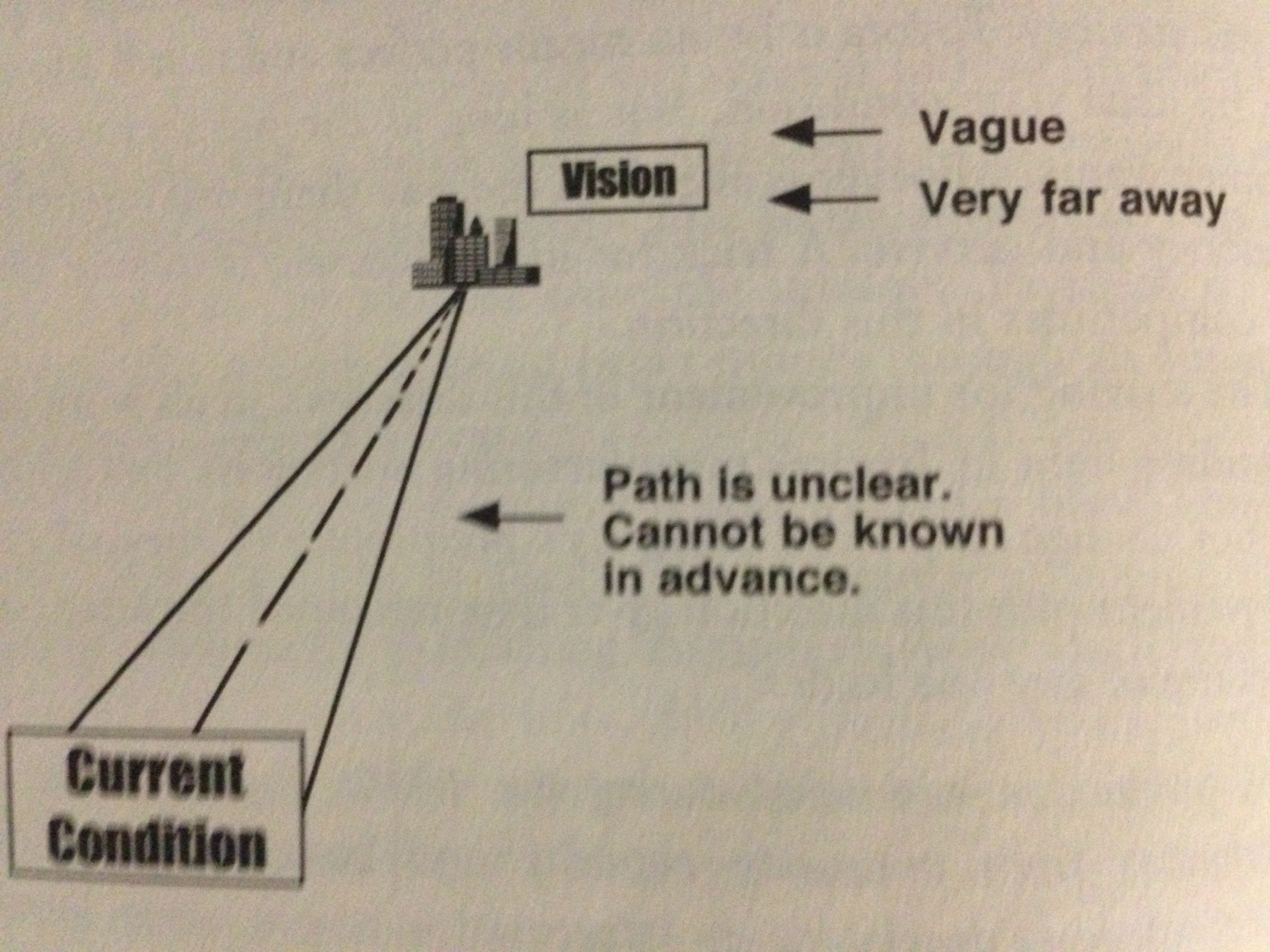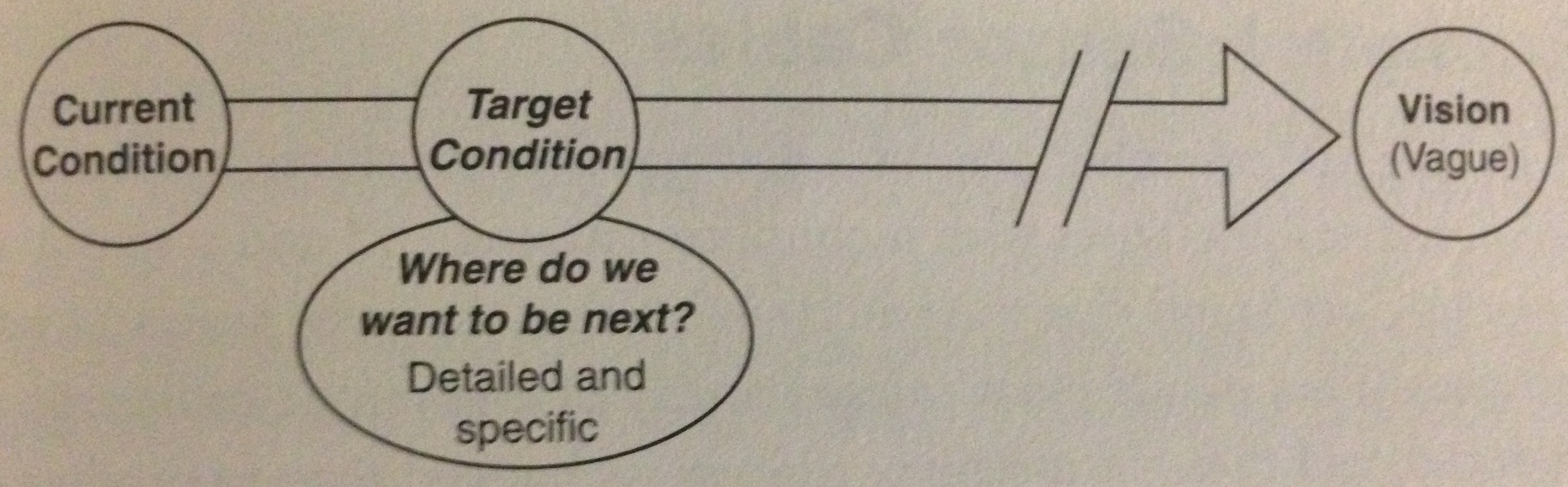 A Vision is something blurry, vague and very distant. The path is unclear and cannot be know in advance. So how do we find and stay on the path? The answer is to create “Target Conditions”.