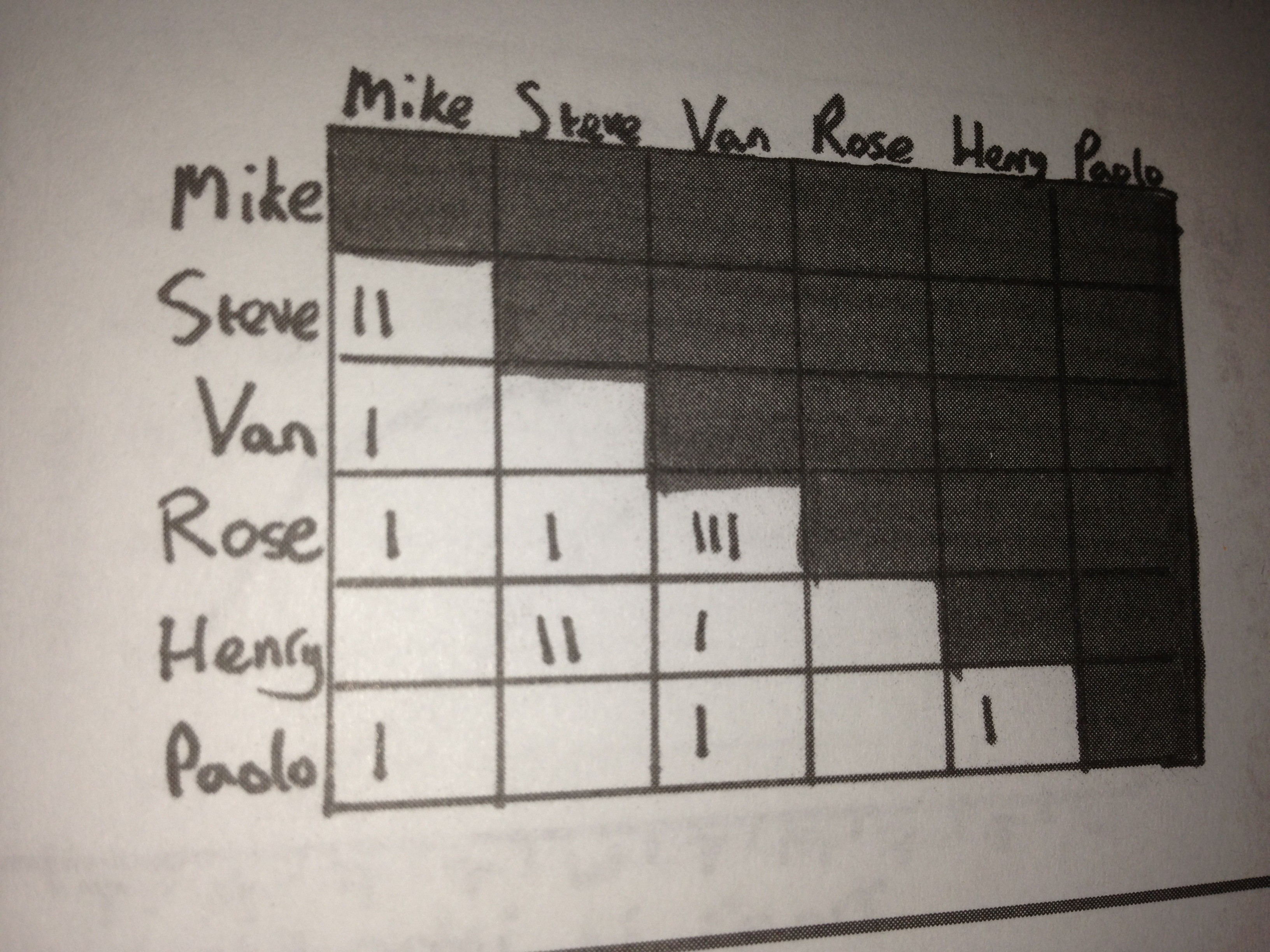 In this case team can use a pairing ladder to show who is paired with who and how often. Below you can find an example of this pairing ladder.